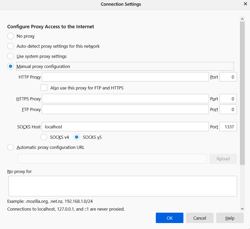 Make sure SOCKS v5 is checked too. After you are done with this guide, remember to revert the settings to their original values, or else FireFox will continue to attempt to connect through the proxy. (You can use any browser, just look up how to.)