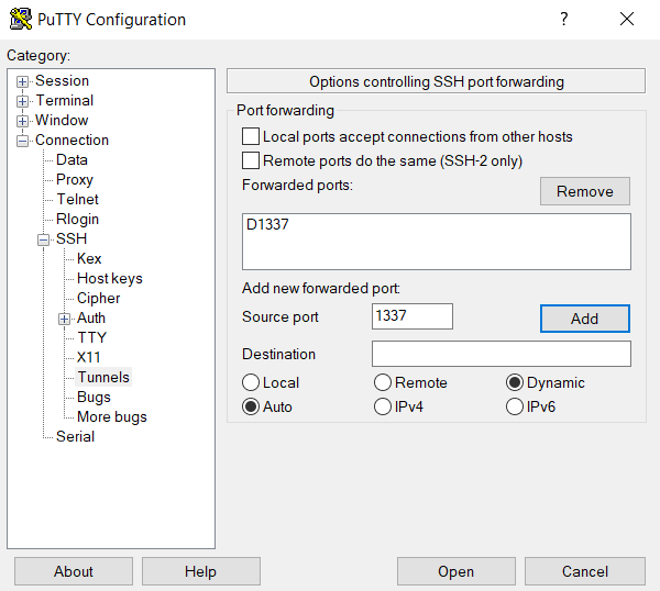 and selecting Dynamic. Then click Add and you should see “D1337” under Forwarded Ports. Now connect to your Remarkable.